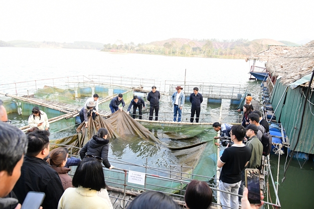 Tiếp đó, đoàn công tác đã thăm mô hình nuôi cá trê Hà Xá tại xã Nghĩa Lộc, tỉnh Nghệ An. Mô hình được triển khai trên diện tích 0,5 ha, thả 15.000 con giống với mật độ 3 con/m². Sau 6 tháng nuôi, cá đạt cỡ trung bình 2,5–3 kg/con, tỷ lệ sống trên 90%, năng suất đạt trên 60 tấn/ha, cao gần gấp đôi so với yêu cầu của dự án. Sản phẩm cá trê Hà Xá được liên kết tiêu thụ trực tiếp với hệ thống nhà hàng gắn với phát triển du lịch tại địa phương, giá bán tại ao dao động từ 50.000–60.000 đồng/kg, mang lại hiệu quả kinh tế rõ rệt cho người nuôi.